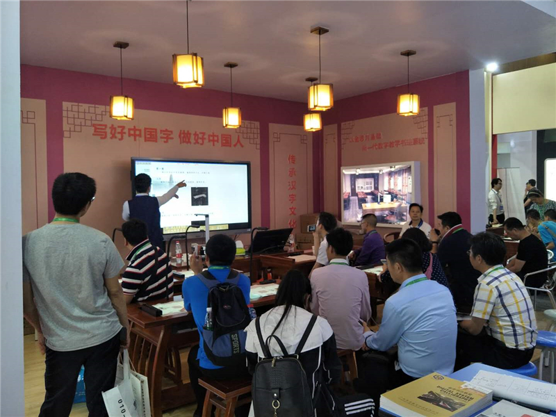 工作人员在向参观客户讲解数字书法教室的授课知识