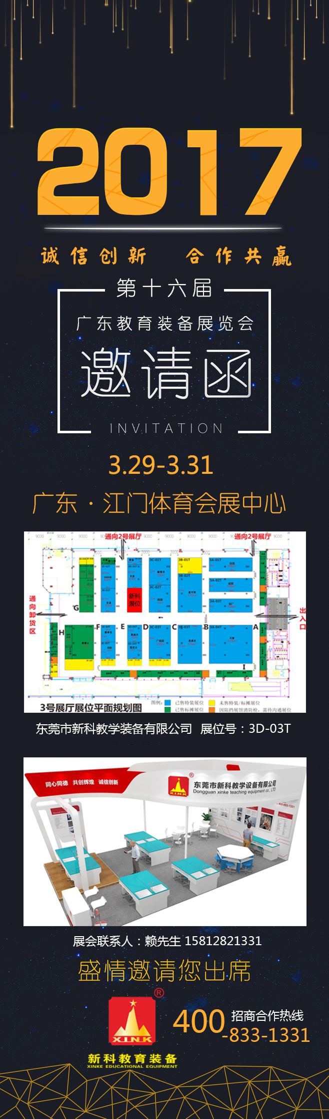 2017年3月29日至31日,由第十六届广东教育装备展览会暨第二届江门·台湾教育装备展览会,新科将携带一系列未来创客教室、创新实验室产品、机器人、3D打印机、VR、数字书法室解决方案亮相该展会,展位号为3D-03T。诚邀莅临各界朋友及新老客户前来参观指导。